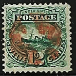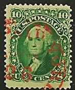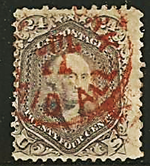 U.S. #72 ave-fine, couple of short perfs, bold RED cancel, Scott Cat. adds $125 for it.