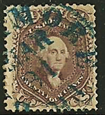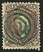 U.S. #68, pale yellow green, vf, with socked on the nose BLUE target cancel, bullseye right on Washington’s eye!